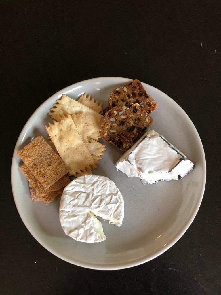 Goat cheese with ash-trim (right) and goat milk brie (left) with assorted crackers.